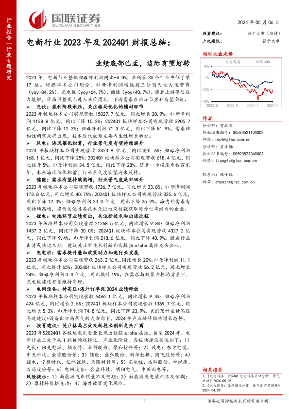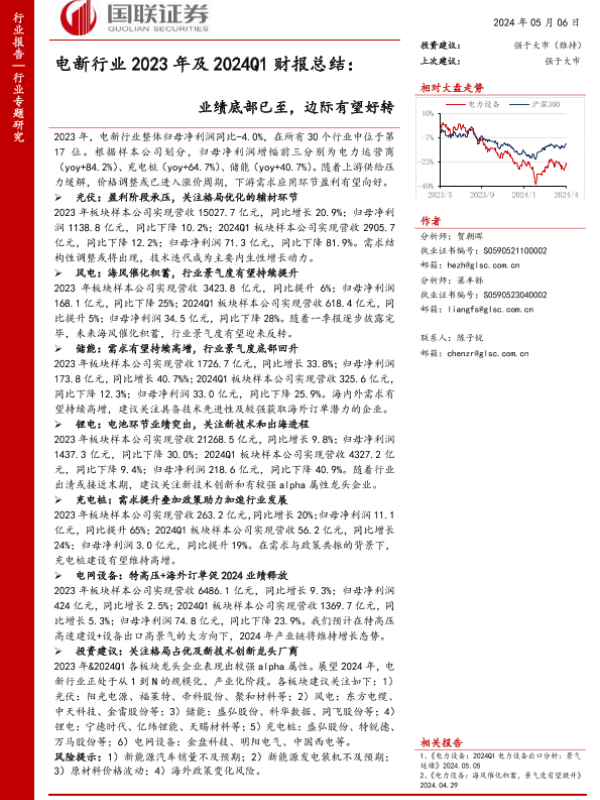 【国联证券】【20240506】电新行业2023年及2024Q1财报总结:业绩底部已至,边际有望好转-48页