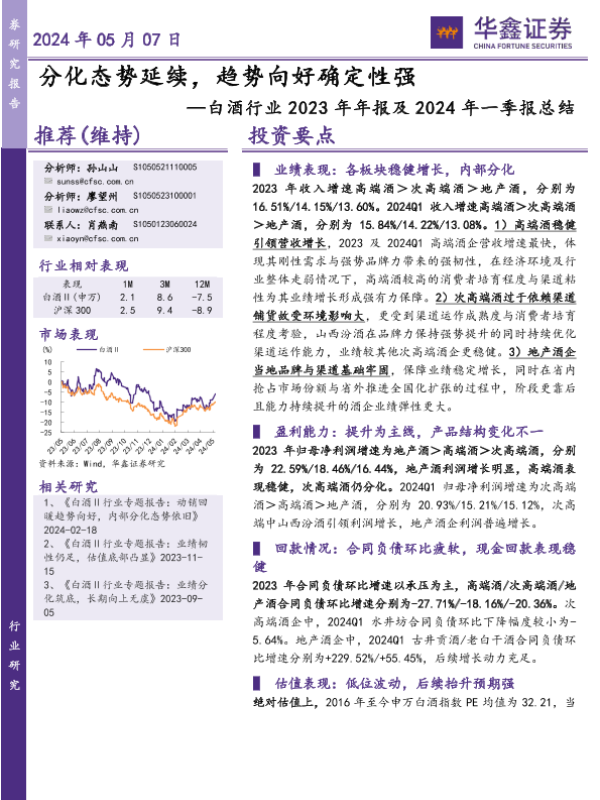 【华鑫证券】【20240507】白酒行业2023年年报及2024年一季报总结:分化态势延续,趋势向好确定性强-27页