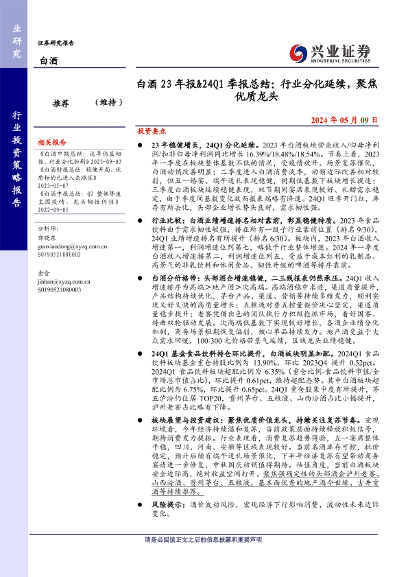 【兴业证券】【20240509】白酒行业23年报&24Q1季报总结:行业分化延续,聚焦优质龙头-22页