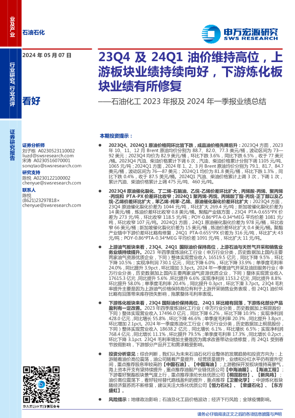 【申万宏源】【20240507】石油化工行业2023年报及2024年一季报业绩总结-17页