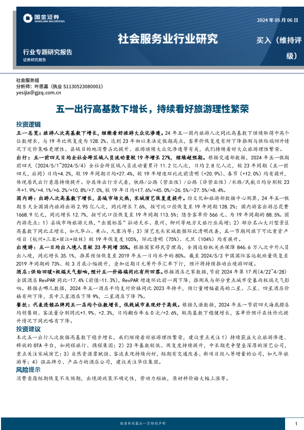 【国金证券】【20240506】社会服务业行业专题研究报告:五一出行高基数下增长,持续看好旅游理性繁荣-17页