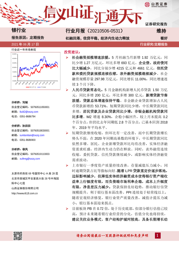 【山西证券】【20210617】银行业月报:社融回落,信贷平稳,经济内生动力释放-13页