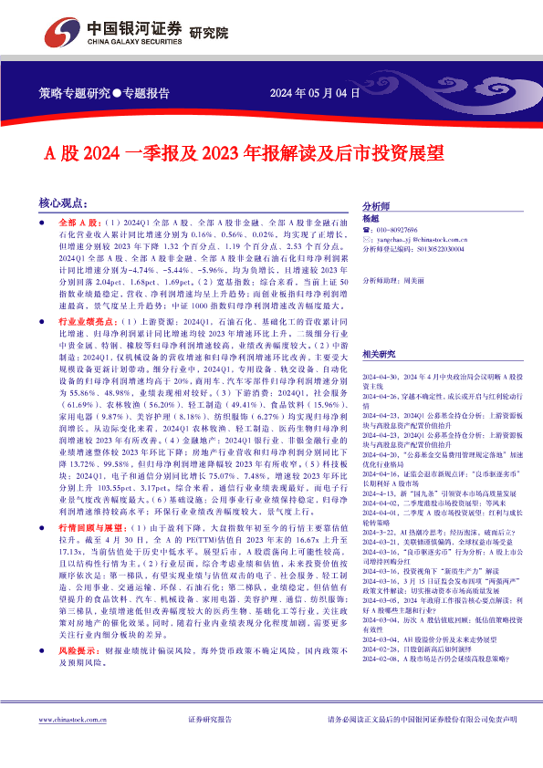 【银河证券】【20240504】A股2024一季报及2023年报解读及后市投资展望-26页