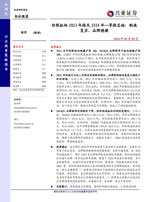 【兴业证券】【20240509】纺服行业板块2023年报及2024年一季报总结:制造复苏,品牌稳健-25页