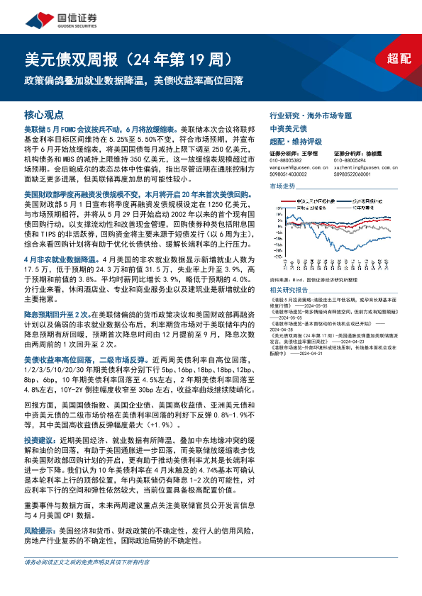 【国信证券】【20240506】美元债双:政策偏鸽叠加就业数据降温,美债收益率高位回落-15页