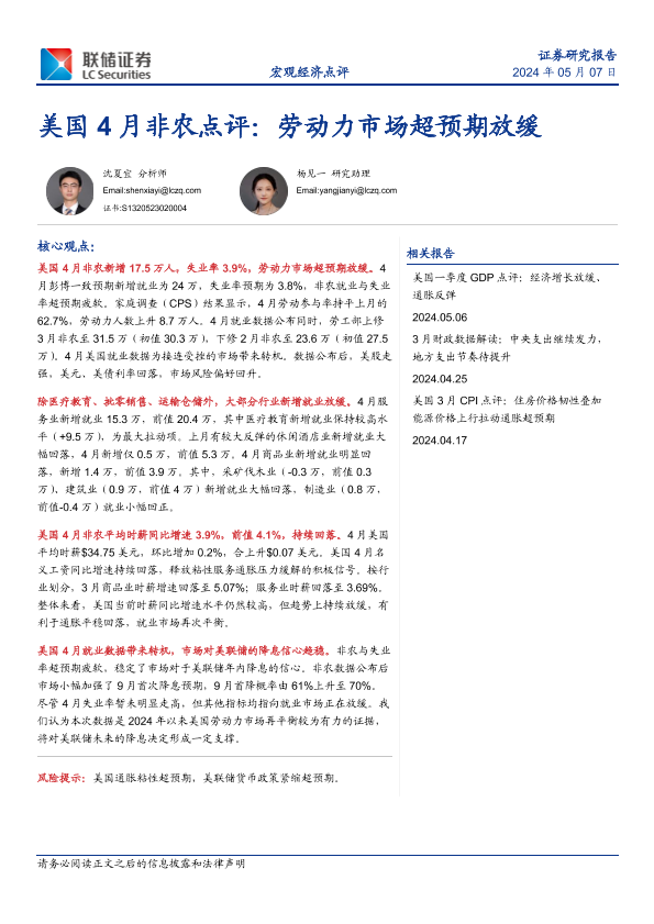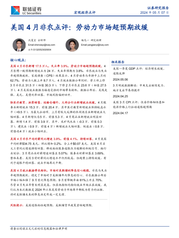 【联储证券】【20240507】美国4月非农点评:劳动力市场超预期放缓-11页