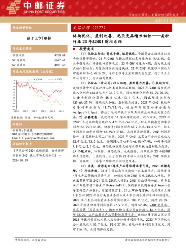 【中邮证券】【20240506】美护行业23年&24Q1财报总结:格局优化,盈利改善,龙头更具增长韧性-43页
