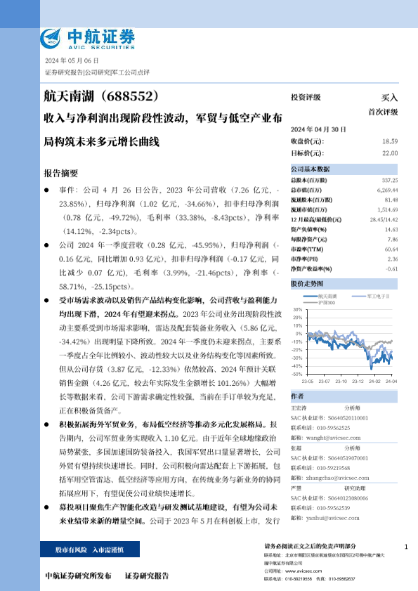 【中航证券】【20240506】航天南湖(688552)收入与净利润出现阶段性波动,军贸与低空产业布局构筑未来多元增长曲线-12页