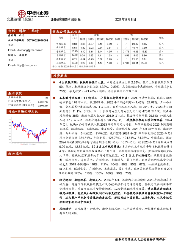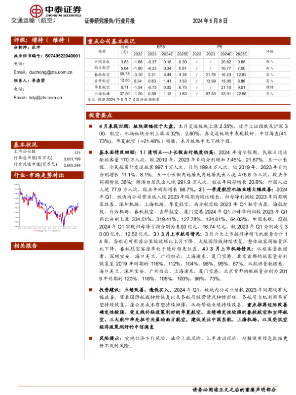 【中泰证券】【20240508】航空机场行业5月投资策略:业绩改善,逢低买入-18页