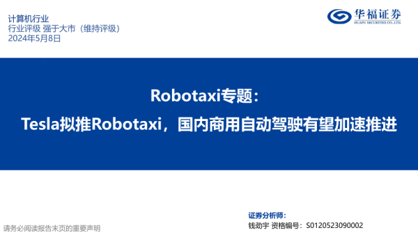 【华福证券】【20240508】计算机行业Robotaxi专题:Tesla拟推Robotaxi,国内商用自动驾驶有望加速推进-19页