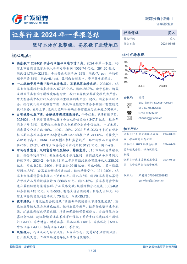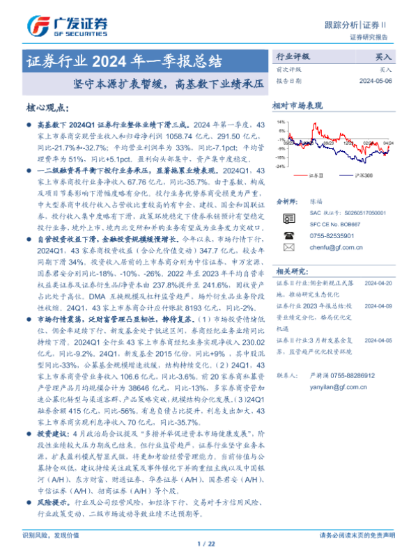 【广发证券】【20240506】证券行业2024年一季报总结:坚守本源扩表暂缓,高基数下业绩承压-22页