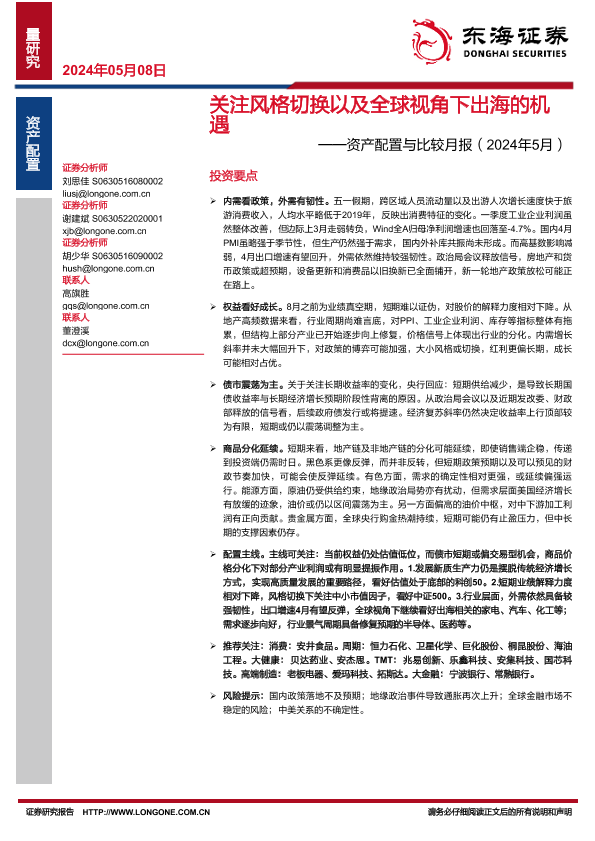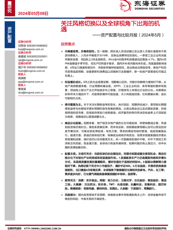 【东海证券】【20240508】资产配置与比较月报(2024年5月):关注风格切换以及全球视角下出海的机遇-29页