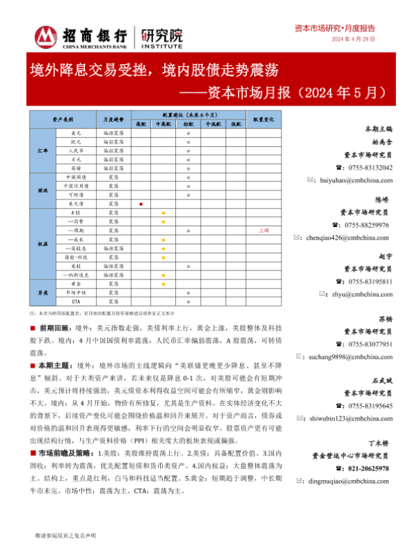【招商银行】【20240429】资本市场月报(2024年5月):境外降息交易受挫,境内股债走势震荡-25页