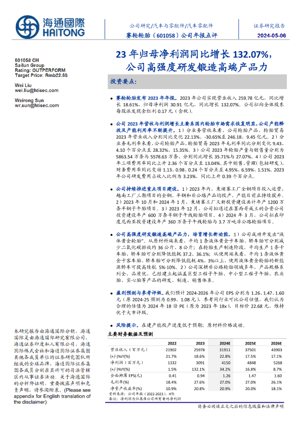【海通国际】【20240506】赛轮轮胎(601058)23年归母净利润同比增长132.07%,公司高强度研发锻造高端产品力-11页