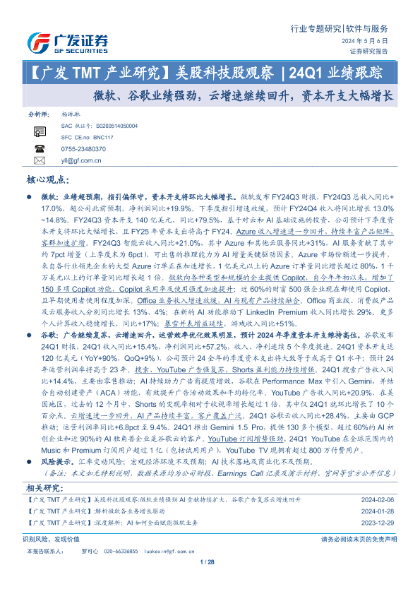 【广发证券】【20240506】美股科技股观察:24Q1业绩跟踪:微软、谷歌业绩强劲,云增速继续回升,资本开支大幅增长-28页