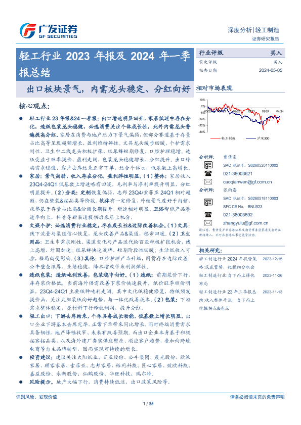 【广发证券】【20240505】轻工行业2023年报及2024年一季报总结:出口板块景气,内需龙头稳定、分红向好-35页