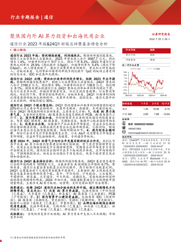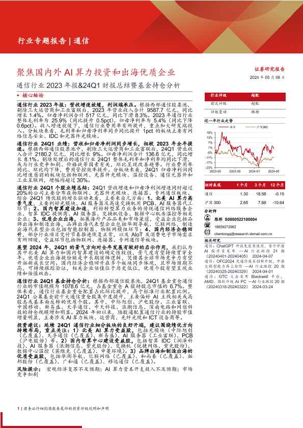 【西部证券】【20240508】通信行业2023年报&24Q1财报总结暨基金持仓分析:聚焦国内外AI算力投资和出海优质企业-15页