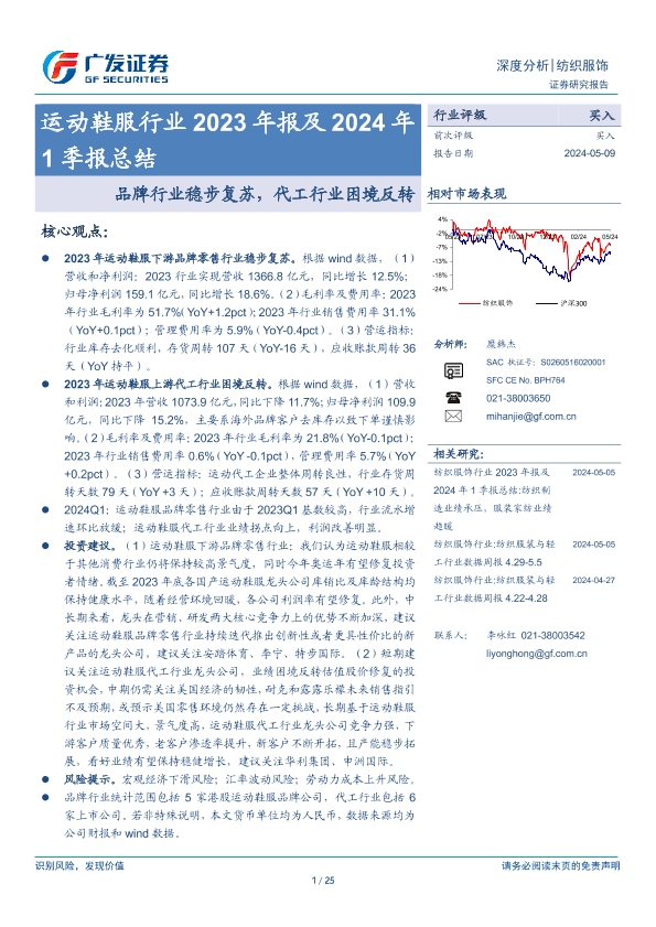 【广发证券】【20240509】运动鞋服行业2023年报及2024年1季报总结:品牌行业稳步复苏,代工行业困境反转-25页