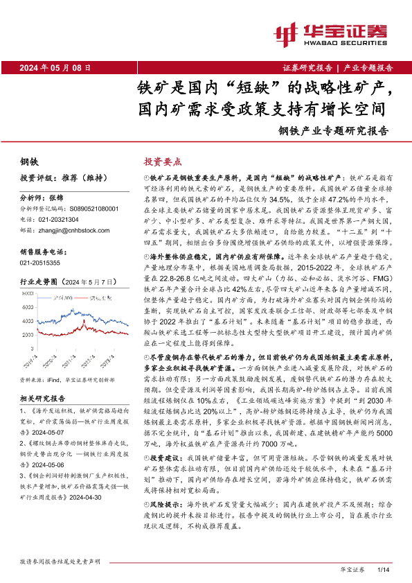 【华宝证券】【20240508】钢铁行业产业专题研究报告:铁矿是国内“短缺”的战略性矿产,国内矿需求受政策支持有增长空间-14页