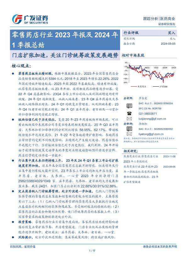【广发证券】【20240505】零售药店行业2023年报及2024年1季报总结:门店扩张加速,关注门诊统筹政策发展趋势-17页