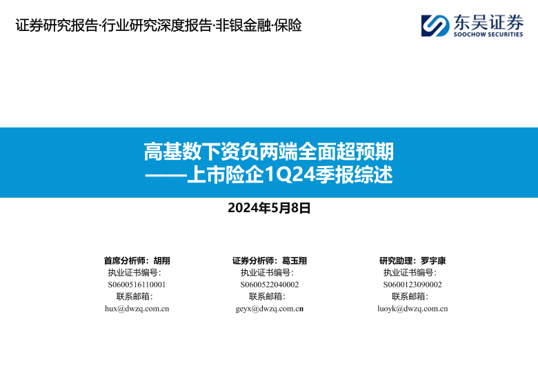 【东吴证券】【20240508】非银金融行业上市险企1Q24季报综述:高基数下资负两端全面超预期-36页