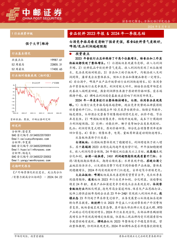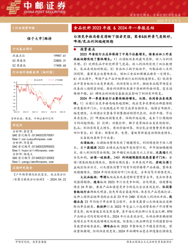 【中邮证券】【20240509】食品饮料行业2023年报&2024年一季报总结:白酒竞争格局愈发清晰下强者更强,零食&饮料景气度较好,啤酒/乳品利润端超预期-34页