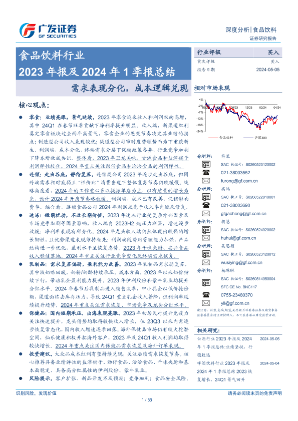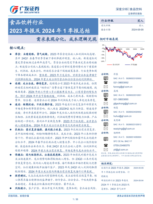 【广发证券】【20240505】食品饮料行业2023年报及2024年1季报总结:需求表现分化,成本逻辑兑现-33页