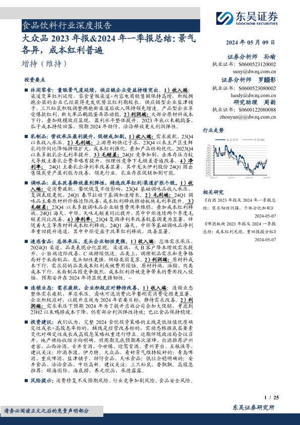 【东吴证券】【20240509】食品饮料行业深度报告:大众品2023年报&2024年一季报总结,景气各异,成本红利普遍-25页