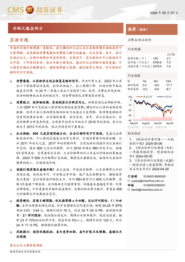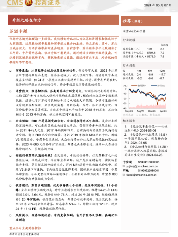 投资建议 白酒升级 经济分析 苏酒 食品饮料