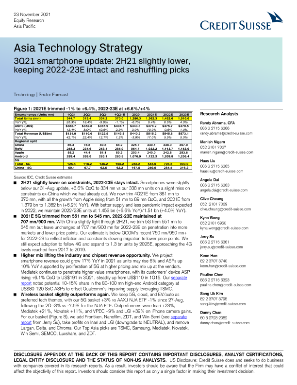 【Credit Suisse】【20211123】瑞信-亚太地区科技行业-第三季度智能手机更新:下半年略低,保持2022至2023年不变,并重新洗牌-23页