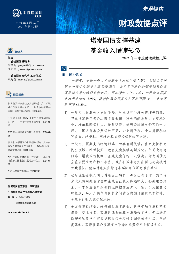 【中诚信国际】【20240426】增发国债支撑基建,基金收入增速转负——2024年一季度财政数据点评-9页