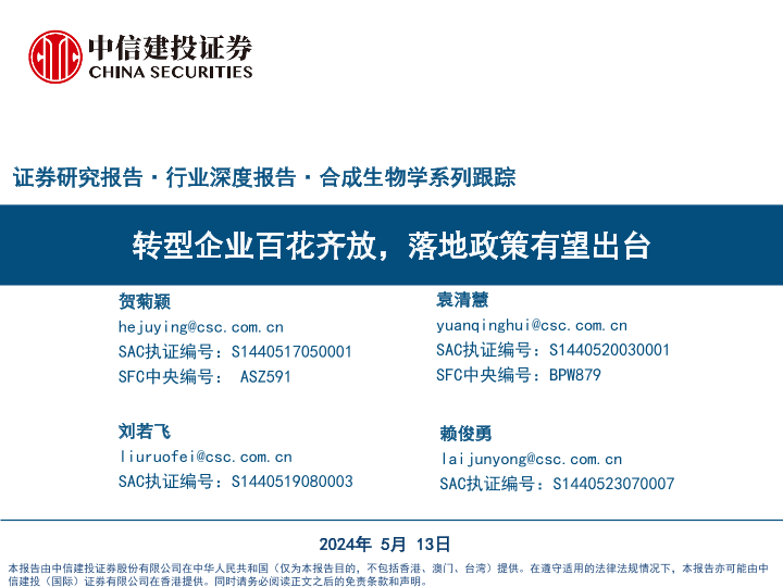 【中信建投证券】【20240513】合成生物学系列跟踪:转型企业百花齐放,落地政策有望出台-54页
