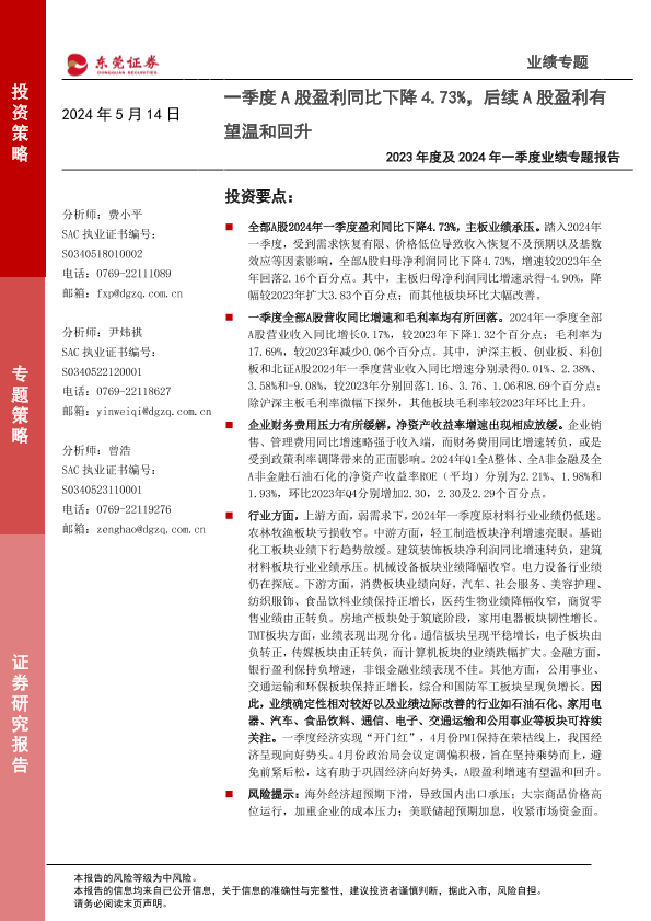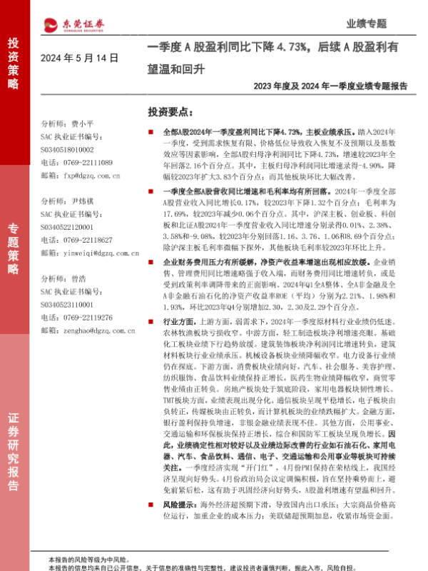 【东莞证券】【20240514】2023年度及2024年一季度业绩专题报告:一季度A股盈利同比下降4.73%,后续A股盈利有望温和回升-21页