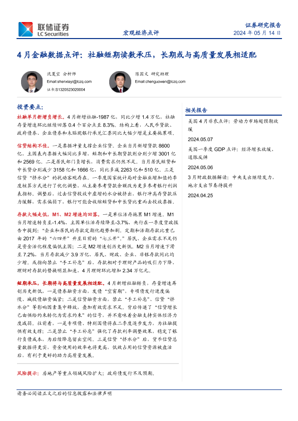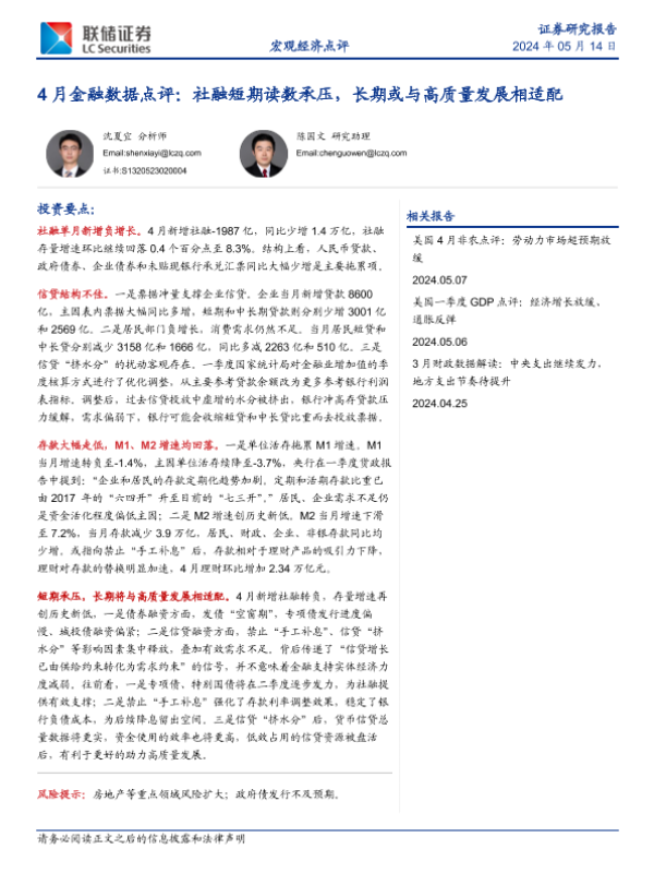 【联储证券】【20240514】4月金融数据点评:社融短期读数承压,长期或与高质量发展相适配-11页