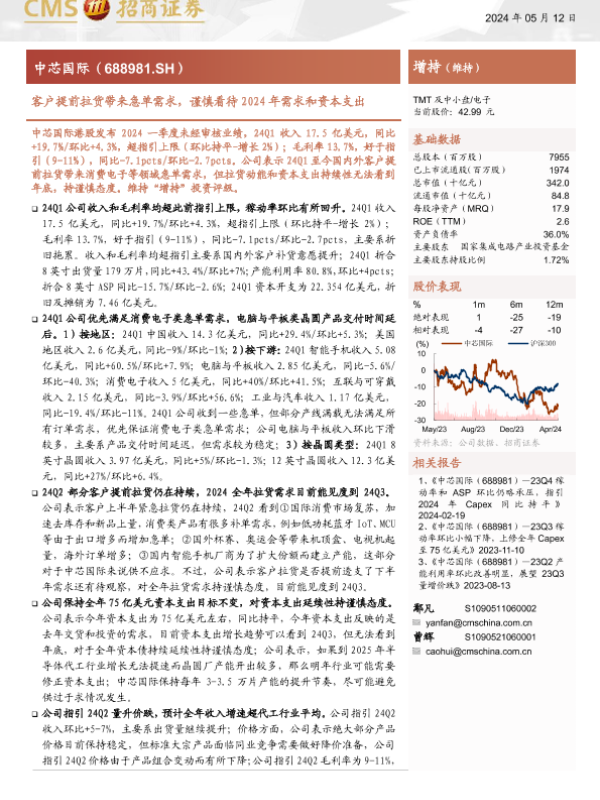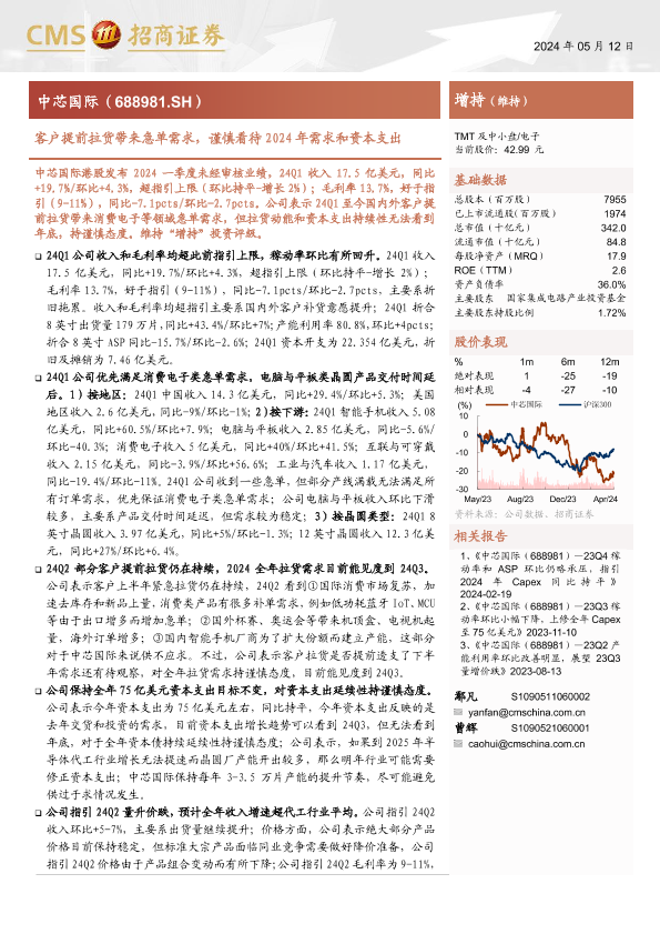 【海通证券】【20240512】中芯国际(688981)客户提前拉货带来急单需求,谨慎看待2024年需求和资本支出-10页