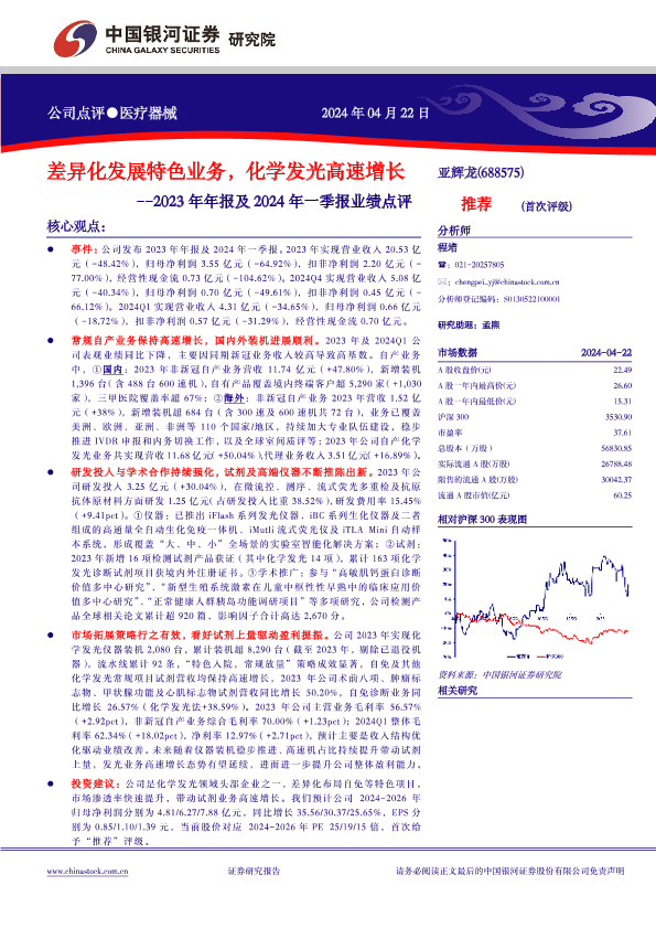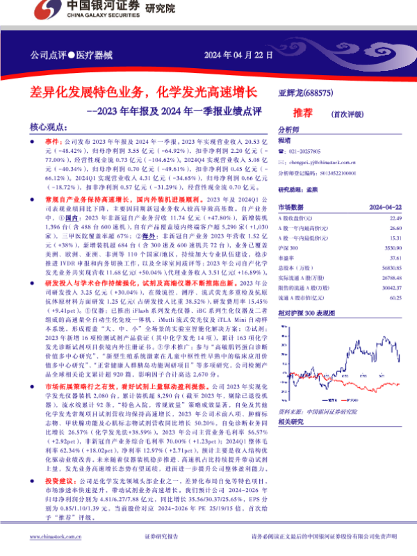 【银河证券】【20240422】亚辉龙-688575.SH-2023年年报及2024年一季报业绩点评:差异化发展特色业务,化学发光高速增长-12页