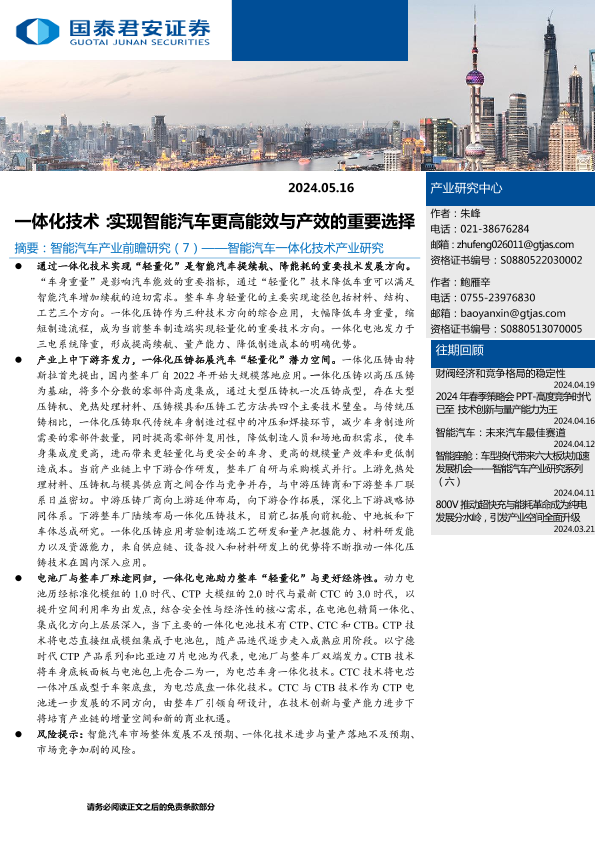 【国泰君安证券】【20240516】产业深度-一体化技术:实现智能汽车更高能效与产效的重要选择-21页
