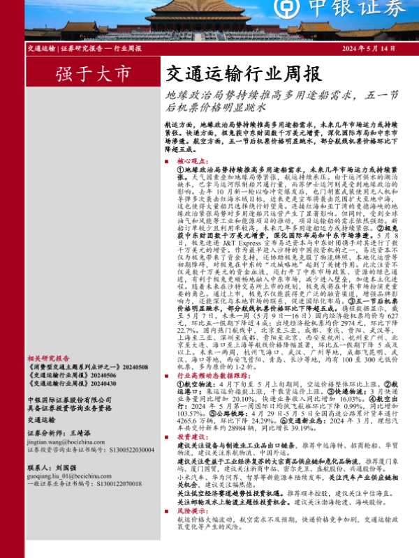 【中银证券】【20240514】交通运输行业:地缘政治局势持续推高多用途船需求,五一节后机票价格明显跳水-26页