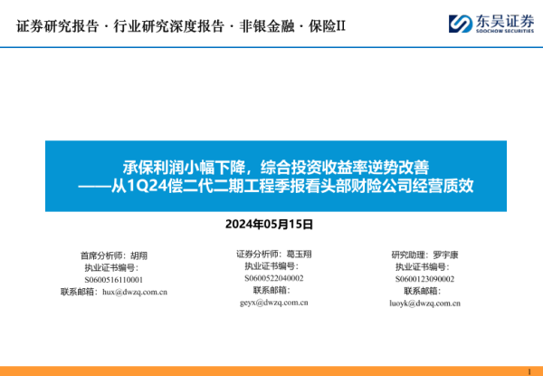 【东吴证券】【20240515】保险行业从1Q24偿二代二期工程季报看头部财险公司经营质效:承保利润小幅下降,综合投资收益率逆势改善-53页