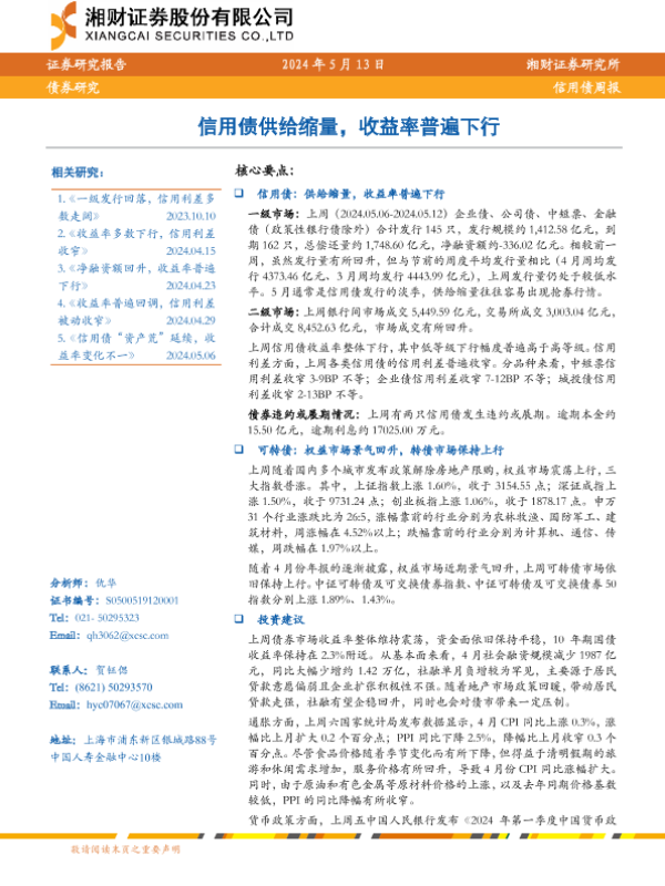【湘财证券】【20240513】信用债:信用债供给缩量,收益率普遍下行-13页