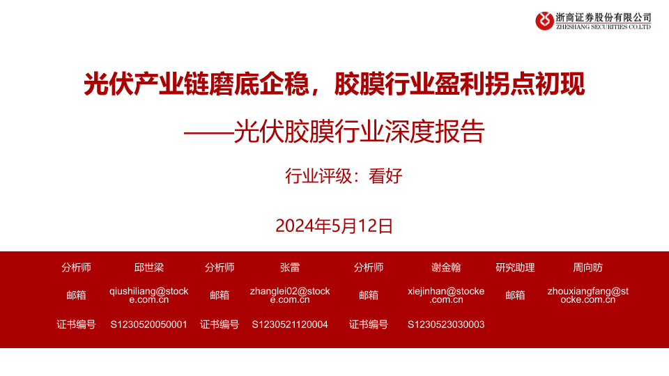 【浙商证券】【20240512】光伏胶膜行业深度报告:光伏产业链磨底企稳,胶膜行业盈利拐点初现-33页