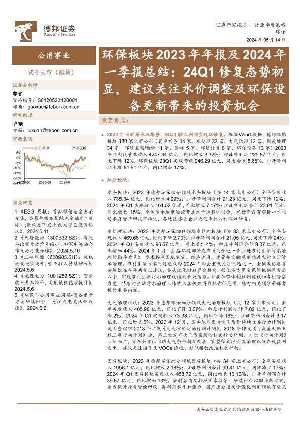 【德邦证券】【20240514】公用事业行业环保板块2023年年报及2024年一季报总结-43页