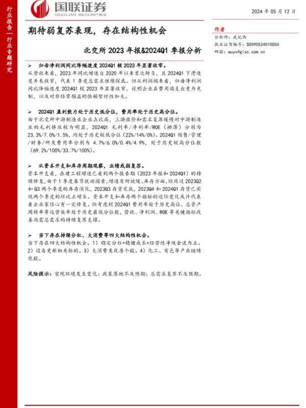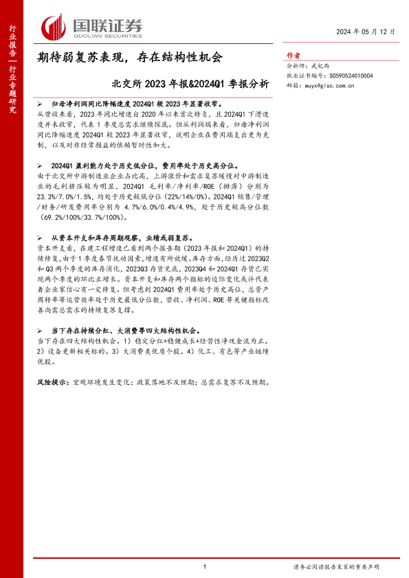 【国联证券】【20240512】北交所2023年报&2024Q1季报分析:期待弱复苏表现,存在结构性机会-13页