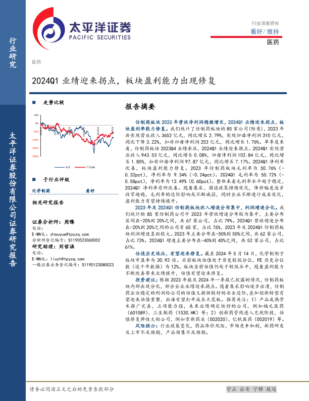 【太平洋证券】【20240514】医药行业深度研究:2024Q1业绩迎来拐点,板块盈利能力出现修复-21页