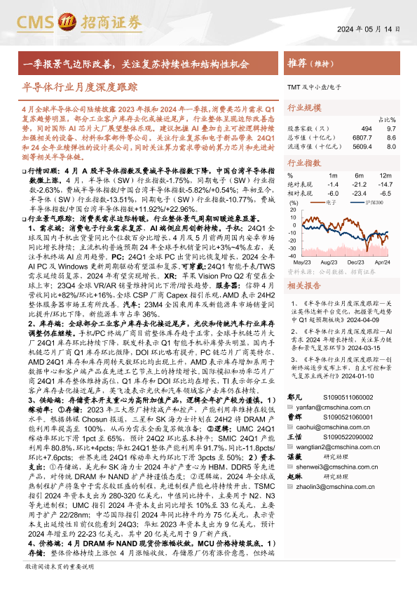 【海通证券】【20240514】半导体行业月度深度跟踪:一季报景气边际改善,关注复苏持续性和结构性机会-95页