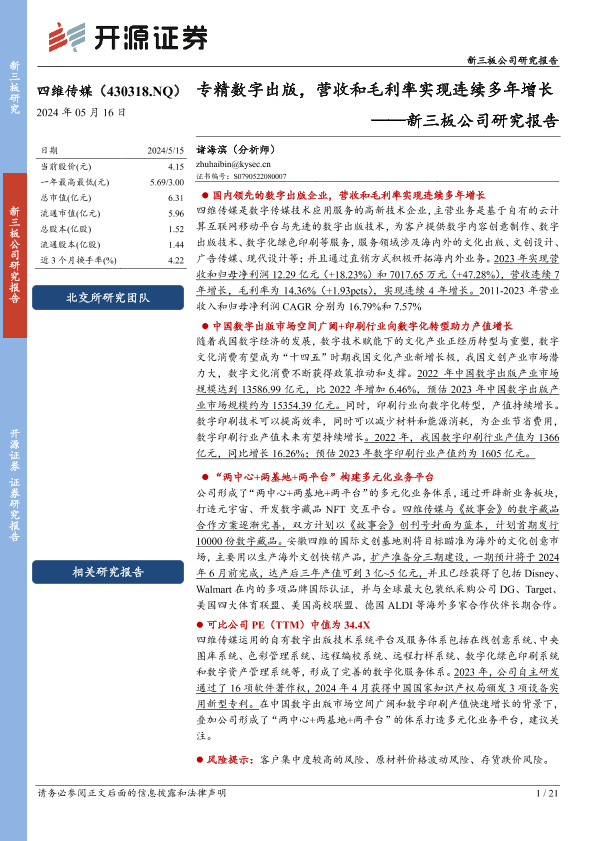 【开源证券】【20240516】四维传媒(430318)新三板公司研究报告:专精数字出版,营收和毛利率实现连续多年增长-21页