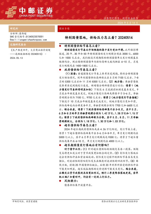 【中邮证券】【20240514】固收专题:特别国债落地,供给压力怎么看?-12页