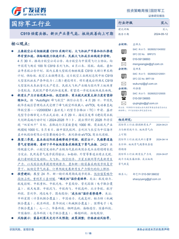 【广发证券】【20240512】国防军工行业:C919供需共振,新兴产业景气高,板块改善向上可期-18页