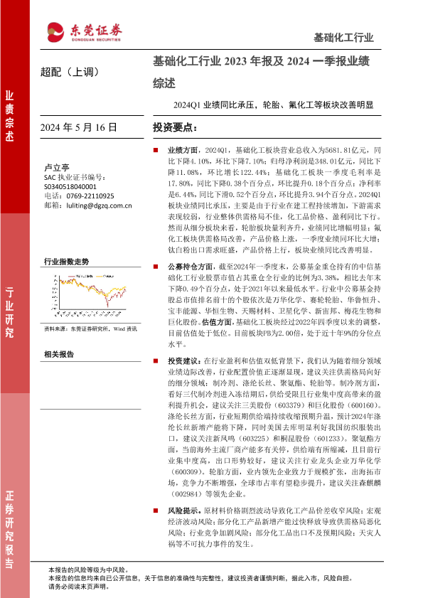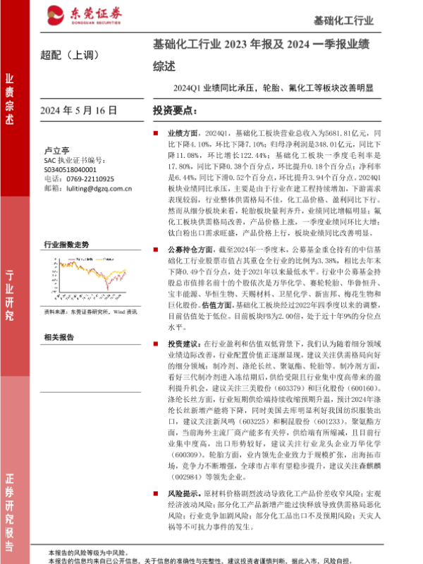 【东莞证券】【20240516】基础化工行业2023年报及2024一季报业绩综述:2024Q1业绩同比承压,轮胎、氟化工等板块改善明显-14页