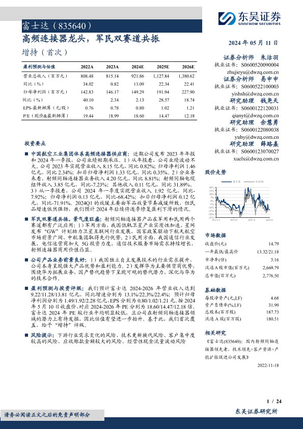 【东吴证券】【20240511】富士达(835640)高频连接器龙头,军民双赛道共振-24页